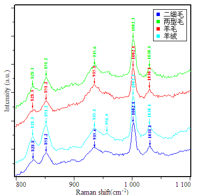 935 cm-1波數(shù)處的拉曼特征峰屬于 螺旋構(gòu)象的C-C骨架伸展振動(dòng),這一峰值表示變異山羊絨纖維的 螺旋含量的多少。從表中數(shù)據(jù)可以看出,毛纖維的 螺旋構(gòu)象的C-C骨架含量要明顯由于絨纖維。C-C骨架振動(dòng)區(qū)出現(xiàn)在890-960 cm-1區(qū),主要是骨架的拉伸振動(dòng),表征變異山羊絨纖維的拉伸性能,通過該特征峰可以為羊毛、羊絨纖維的拉伸、防粘縮等工藝提供指導(dǎo)意見。