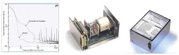 美國SRS公司銣鐘PRS10的10MHz輸出來自第三倍頻,應力補償(SC-cut)晶體振蕩器工作在一個恒溫室中,雙回路RF合成器(晶體頻率22.482MHz)產(chǎn)生359.72MHz,并讓6.834 GHz頻率通過階躍恢復二極管。這樣的設計可以使相位噪聲非常低(< −130 dBc/Hz at 10 Hz),即便在沒有鎖定銣原子的情況下,其輸出表現(xiàn)也很良好(老化率:<5 × 1E−10 /day),與傳統(tǒng)銣鐘相比相位噪聲降低42dB(如下圖),并使用側臂裝有1毫克銣的燈。消除了銣耗盡作為一種失效機制,并提供了更好的溫度控制,而沒有多余的閃爍噪聲。