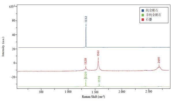 通過位于1332cm-1 拉曼特征峰判斷本次實驗的三個樣品分別為純金剛石、石墨以及石墨及金剛石的過渡體,確定了鉆石的真假。