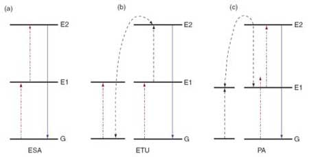無(wú)機(jī)材料有三個(gè)基本發(fā)光原理:激發(fā)態(tài)吸收(Excited-state absorption, ESA),能量傳遞上轉(zhuǎn)換(Energy transfer upconversion, ETU)和光子雪崩(Photon avalanche, PA)。