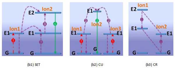 能量傳遞是指通過(guò)非輻射過(guò)程將兩個(gè)能量相近的激發(fā)態(tài)離子通過(guò)非輻射耦合,其中一個(gè)把能量轉(zhuǎn)移給另一個(gè)回到低能態(tài),另一個(gè)離子接受能量而躍遷到更高的能態(tài)。能量傳遞上轉(zhuǎn)換可以發(fā)生在同種離子之間,也可以發(fā)生在不同的離子之間。能量傳遞包含了連續(xù)能量傳遞(Successive Energy Transfer,SET)、合作上轉(zhuǎn)換(Cooperative Upconversion,CU)和交叉弛豫(Cross Relaxation,CR)三類。1