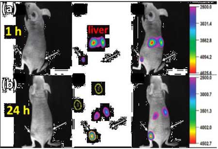 上轉(zhuǎn)換發(fā)光納米材料(UCNPs)具有熒光壽命長(zhǎng)、潛在生物毒性低、穿透深度大、對(duì)生物組織損傷小且?guī)缀鯖](méi)有背景光等顯著優(yōu)點(diǎn),近年來(lái)在生物成像及生物檢測(cè)等領(lǐng)域已經(jīng)得到廣泛應(yīng)用,下圖未上轉(zhuǎn)換納米顆粒在生物活體中進(jìn)行腫瘤標(biāo)記。