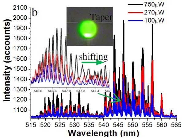 Figure 6.不同泵浦功率下Er-Yb共摻雜的回音壁式微腔上轉(zhuǎn)換激射2