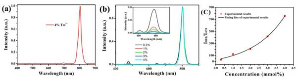 Figure 10(a)是NaYF4: 20%Yb3+, 4%Tm3+的上轉(zhuǎn)換發(fā)射譜,只看到一個(gè)800nm下的發(fā)射峰,是高對(duì)比度深層組織熒光成像的理想情況。Figure 10(b)通過(guò)調(diào)節(jié)Tm3+的摻雜濃度來(lái)研究此現(xiàn)象的物理機(jī)理,數(shù)據(jù)中通過(guò)對(duì)800nm的發(fā)射進(jìn)行強(qiáng)度歸一化之后,發(fā)現(xiàn)470nm的發(fā)射峰隨著Tm3+的濃度增加,強(qiáng)度減弱。在Figure 10(c)上可以看到I800/I470比值隨著Tm3+摻雜濃度的增加,呈指數(shù)增長(zhǎng)。