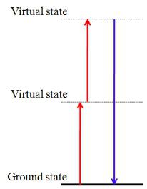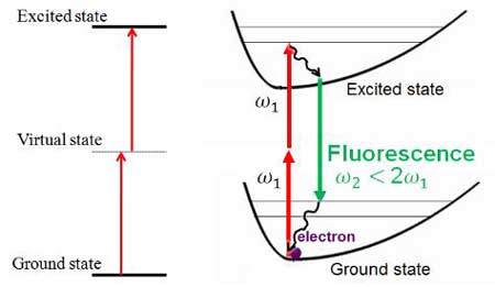 產(chǎn)生原理:熒光分子吸收第一個(gè)光子后,躍遷到虛能級(jí)上,該能級(jí)僅能存在幾飛秒,便自動(dòng)返回基態(tài),第二個(gè)光子必須在這幾飛秒內(nèi)與虛能級(jí)上的分子作用,從基態(tài)躍遷到激發(fā)態(tài)(下圖左),能量較大的激發(fā)態(tài)分子,通過(guò)無(wú)輻射躍遷和熒光發(fā)射使自己回到最低電子激發(fā)態(tài)的最低振動(dòng)能級(jí)(下圖右)。