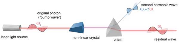 兩個(gè)同樣頻率的光子與非線性材料相互作用之后,得到一個(gè)新的光子,其能量是初始能量的兩倍。