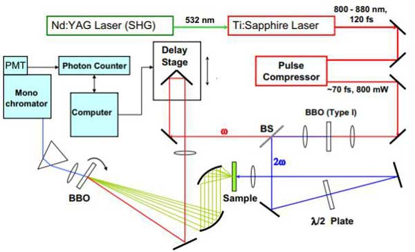 下方為飛秒熒光上轉(zhuǎn)換裝置原理圖:飛秒激光其的激光脈沖經(jīng)過(guò)分束片分成兩束,一束激光脈沖用來(lái)激發(fā)樣品發(fā)射熒光,并把熒光收集后匯聚到BBO(偏硼酸鋇)晶體上,另一束光作為快門,門控光脈沖經(jīng)過(guò)光學(xué)延遲線,也匯聚到BBO上。然后記錄樣品受激發(fā)之后不同時(shí)刻熒光強(qiáng)度信息。