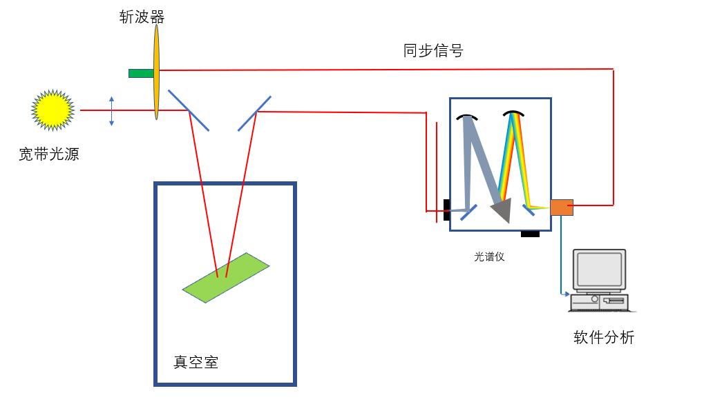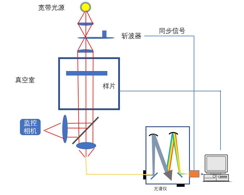 與反射式類(lèi)似,斬波器同樣將探測(cè)光調(diào)制成脈沖光,經(jīng)透鏡組將探測(cè)光變?yōu)槠叫泄?,?jīng)待測(cè)樣片后獲得類(lèi)似透射譜的測(cè)試。*終探測(cè)光由光纖引入到光譜儀進(jìn)行分析。在光路中另一端,經(jīng)過(guò)成像系統(tǒng),用監(jiān)控相機(jī)可以對(duì)真空腔內(nèi)部進(jìn)行監(jiān)控。