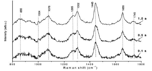 圖2:正常人口腔粘膜內(nèi)窺鏡拉曼光譜,分別對應不同曝光時間,0.1s,0.5s,1s