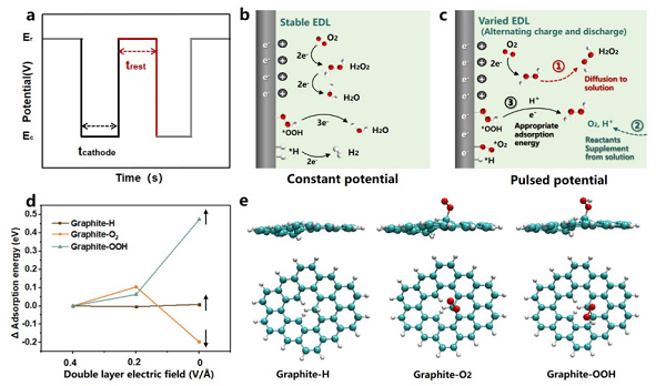 (a)脈沖電催化中的tcathode and trest;(b)、(c) 恒電位電催化和脈沖電位電催化之間的反應(yīng)路徑存在差異;(d) EDL電場強(qiáng)度變化對(duì)ORR中間體吸附能的影響;(e) 具有固有缺陷的石墨烯的中間體(*H/*O2/*OOH)吸附模型。