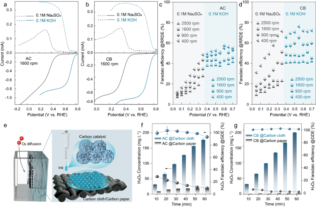 圖1 不同碳基催化劑RRDE性能及GDE下H2O2合成特性