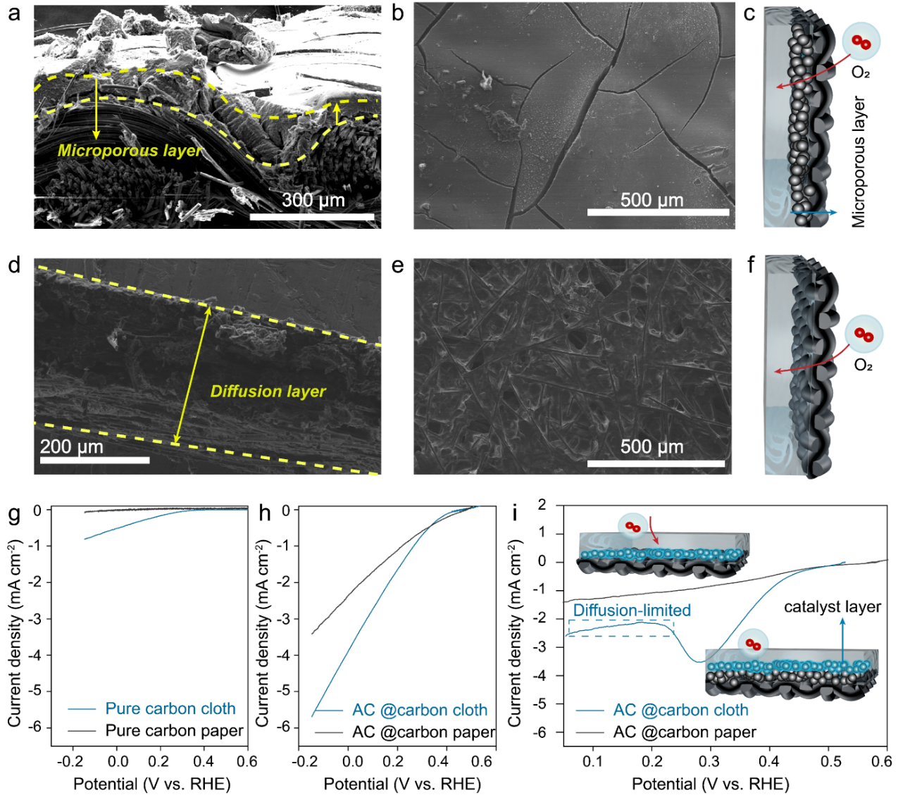 實(shí)驗(yàn)利用氣體擴(kuò)散電極(GDE)探討微環(huán)境對(duì)H2O2合成特性的影響。研究表明使用碳布基底相對(duì)于碳紙同樣具有更優(yōu)的法拉第效率和H2O2合成特性。相較于只具有擴(kuò)散層的碳紙,碳布微孔層的存在會(huì)輔助構(gòu)建反應(yīng)物聚集的界面環(huán)境進(jìn)而強(qiáng)化反應(yīng)動(dòng)力學(xué);在GDE和IME測試體系中AC@carbon cloth相比于AC@ carbon paper 更優(yōu)的動(dòng)力學(xué)活性證實(shí)了這一觀點(diǎn)。
