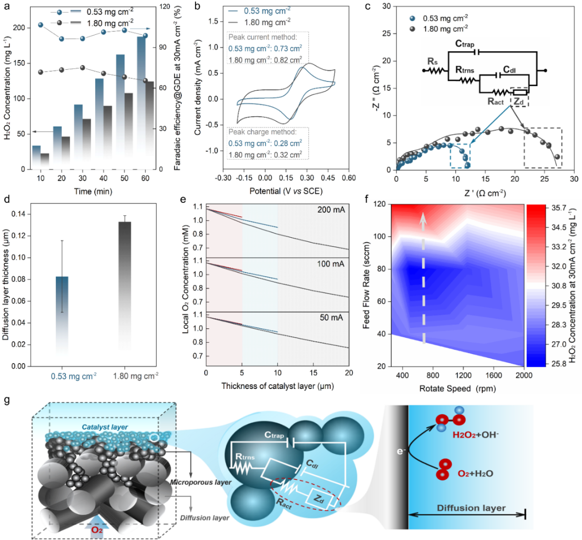 本文構(gòu)建兩種不同催化劑負(fù)載量的GDEs來探究界面反應(yīng)物(O2)傳質(zhì)擴(kuò)散和聚集效應(yīng)。實(shí)驗(yàn)發(fā)現(xiàn)增加催化劑負(fù)載量會(huì)增加GDE電化學(xué)活性面積,H2O2法拉第效率下降至~70%,這說明低負(fù)載量電極具有更高的活性位利用率;結(jié)合EIS分析界面擴(kuò)散動(dòng)力學(xué)發(fā)現(xiàn),減少催化劑負(fù)載量導(dǎo)致擴(kuò)散層厚度下降,促進(jìn)O2輸運(yùn),進(jìn)而構(gòu)建富氧界面微環(huán)境,證明了構(gòu)建O2富集的界面環(huán)境是提高活性位利用效率,強(qiáng)化反應(yīng)活性的關(guān)鍵。