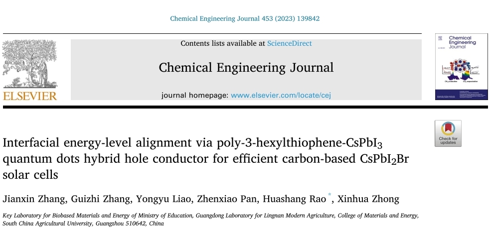 近日,華南農業(yè)大學饒華商&鐘新華團隊在碳基無機CsPbI2Br鈣鈦礦太陽電池的空穴傳輸材料上取得重要進展,研究成果以“Interfacial energy-level alignment via poly-3-hexylthiophene-CsPbI3 quantum dots hybrid hole conductor for efficient carbon-based CsPbI2Br solar cells”為題發(fā)表在Chemical Engineering Journal(DOI:10.1016/j.cej.2022.139842)上。華南農業(yè)大學張鍵鑫博士生為*一作者,饒華商副教授為通訊作者。
