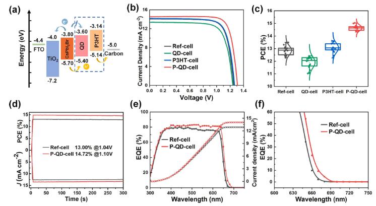 Fig. 3. (a) Energy-level alignment diagram of CsPbI2Br C-PSCs. (b) J-V curves of Ref-, QD-, P3HT-, and P-QD-cells. (c) Distribution of PCE of the studied solar cells. (d) SPO curves, (e,f) EQE spectra of Ref-, and P-QD-cells.