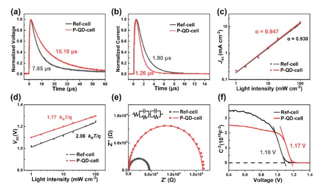 Fig. 4. (a) TPC, (b) TPV, (c,d) Jsc/Voc dependence on light intensities, (e) Fitted Nyquist plot curves under dark conditions, and (f) Mott-Schottky plots for Ref- and PQD-cell.