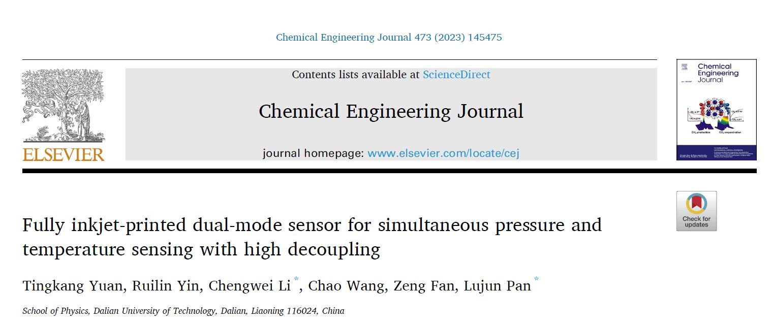 近日,大連理工大學(xué)潘路軍教授課題組在柔性雙模態(tài)傳感器領(lǐng)域取得重要進(jìn)展,研究成果以“Fully inkjet-printed dual-mode sensor for simultaneous pressure and temperature sensing with high decoupling”為題發(fā)表在工程技術(shù)領(lǐng)域期刊《Chemical Engineering Journal》。大連理工大學(xué)袁廷康博士為文章*一作者,大連理工大學(xué)李成偉助理研究員和潘路軍教授為通訊作者。