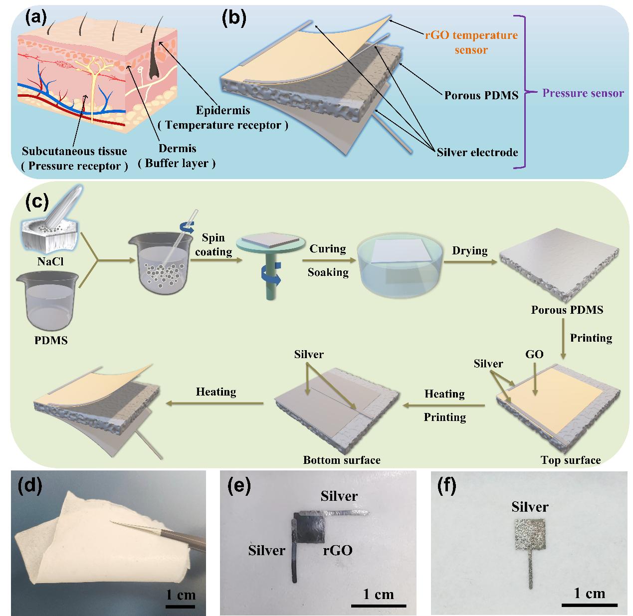 圖1. (a)人體皮膚結(jié)構(gòu)示意圖。(b)具有仿生結(jié)構(gòu)的柔性壓力-溫度雙模態(tài)傳感器的結(jié)構(gòu)示意圖。(c)利用鹽模板法以及噴墨打印技術(shù)制備雙模態(tài)傳感器的實(shí)驗(yàn)過(guò)程示意圖。(d)多孔PDMS 介電層的照片。(e)rGO 溫度傳感器的照片。(f)底部為銀電極的數(shù)碼照片。