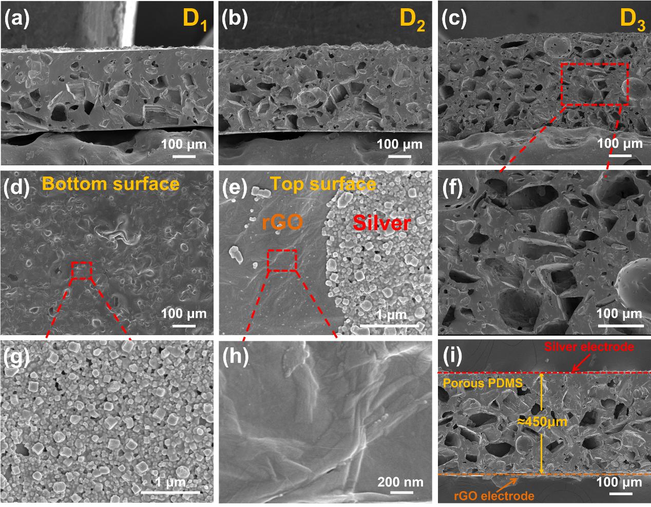 圖2. (a)-(c)不同比例多孔PDMS的截面SEM圖像。(d)底面和(e)頂面的SEM圖像。(f)孔結(jié)構(gòu)、(g)底表面和 (h) rGO 納米片的放大 SEM 圖像。(i) 壓力-溫度雙模態(tài)傳感器的截面 SEM 圖像。