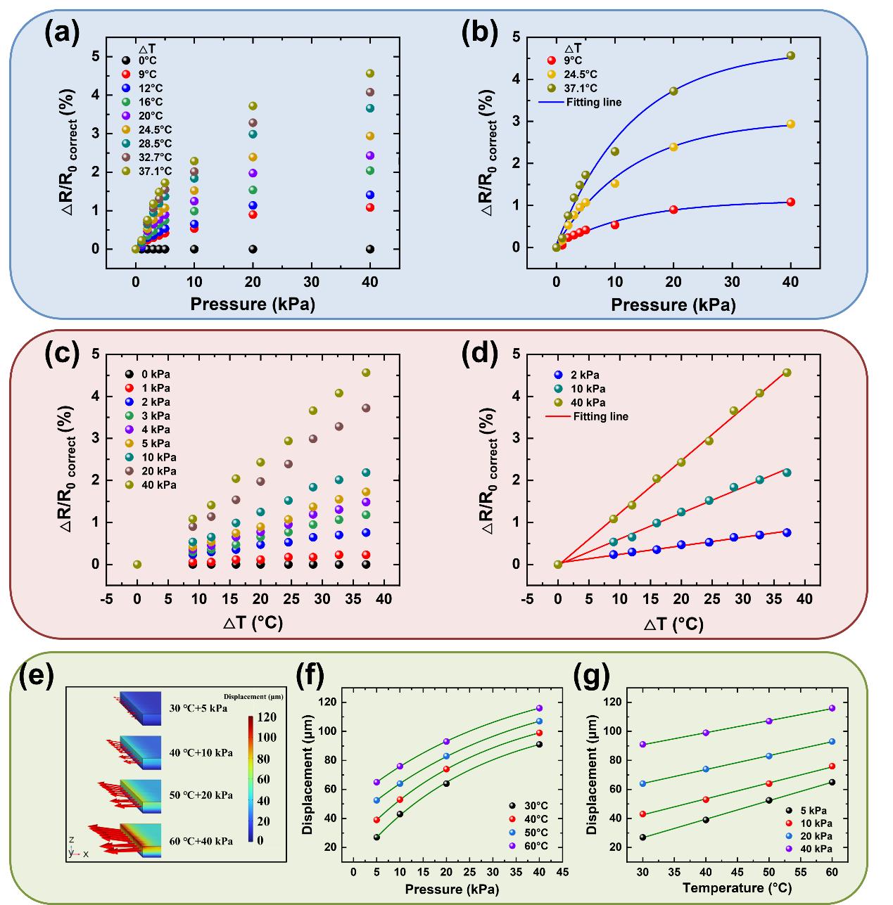 圖7. (a)不同溫差下電阻變化率的修正值和壓力變化的關(guān)系。(b)三種溫差下電阻變化率修正值與壓力的擬合關(guān)系。 (c)不同壓力下電阻變化率的修正值和溫差的關(guān)系。(d)三種壓力下電阻變化率修正值與溫差的擬合關(guān)系。(e) 不同壓力和溫度狀態(tài)下 PDMS 橫向位移分布的模擬結(jié)果。(f)-(g) PDMS 在不同壓力和溫度條件下的橫向位移模擬數(shù)據(jù)。