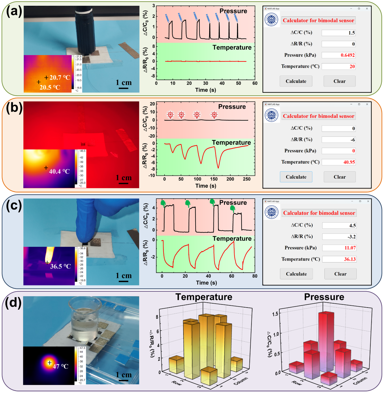 圖8. 使用雙模態(tài)傳感器分別監(jiān)測(cè)三種不同情況下的電容和電阻變化:(a)馬克筆接觸、(b)紅外燈照射和(c)手指按壓,并通過(guò)設(shè)計(jì)的轉(zhuǎn)換應(yīng)用程序獲得實(shí)時(shí)溫度和壓力。(d) 在 3×3 傳感陣列上放置一個(gè)裝有熱水的燒杯,不同單元的電阻和電容響應(yīng)分布。