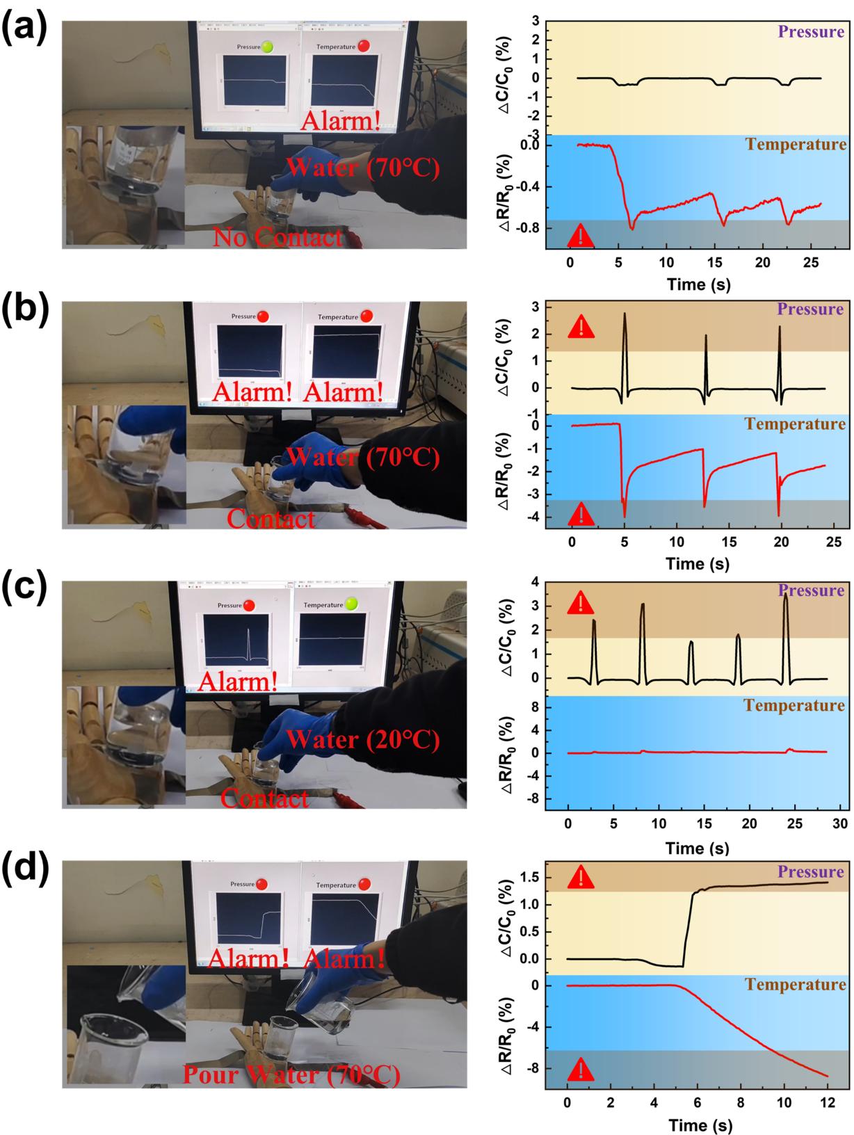 圖9. 基于雙模式傳感器的雙重監(jiān)控和警報(bào)系統(tǒng),可應(yīng)對(duì)各種溫度和壓力變化。裝有熱水的燒杯(a)接近雙模式傳感器時(shí)未與之接觸,(b)與雙模式傳感器接觸。(c)盛有室溫水的燒杯與雙模傳感器接觸。(d)向放置在雙模傳感器上方的空燒杯中倒入熱水