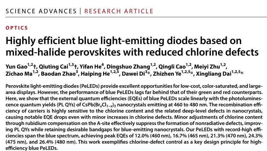 近日,浙江大學(xué)材料學(xué)院葉志鎮(zhèn)院士團隊在藍光發(fā)光二極管效率提升方面取得重要進展,研究成果以“Highly efficient blue light-emitting diodes based on mixed-halide perovskites with reduced chlorine defects”為題發(fā)表在國際**期刊Science Advances (doi:10.1126/sciadv.ado5645)上。浙江大學(xué)為該論文第一單位,高贇博士與蔡秋婷博士為共同第一作者,葉志鎮(zhèn)院士、戴興良研究員、狄大衛(wèi)教授為共同通訊作者。
