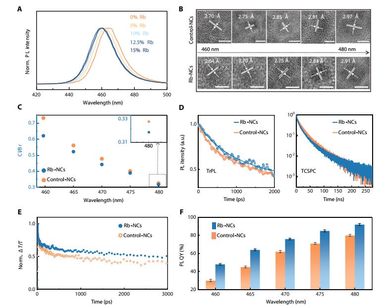 團隊以不同時間尺度下的光譜觀察了氯含量與氯缺陷及材料光學(xué)性能之間的變化與聯(lián)系,得出氯含量與納米晶薄膜中缺陷及熒光量子產(chǎn)率呈負相關(guān)的定性關(guān)系,并提出一條提升藍光LED器件性能的關(guān)鍵思路,即降低氯含量來抑制氯缺陷。通過A位銣補償策略,在保證CsPb(BrxCl1-x )3納米晶發(fā)光波長沒有偏移的情況下有效降低了氯含量,明顯抑制了缺陷,提升納米晶光學(xué)性能。