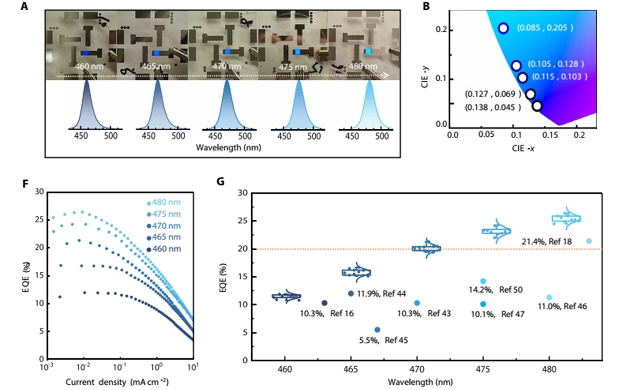團隊基于含銣納米晶制備的鈣鈦礦藍光LED器件在顯示需要的波段下均實現(xiàn)了更高的器件效率,特別是480 nm的器件效率達到了26.4%,是截止目前鈣鈦礦藍光LED器件中的*高效率。