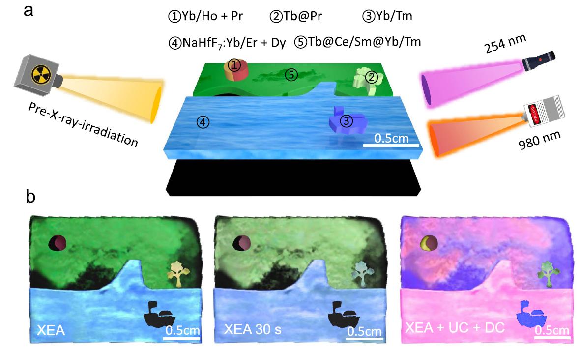 柔性X射線探測器能夠用于高度彎曲目標(biāo)物的三維成像,成為當(dāng)前研究熱點(diǎn)。稀土摻雜氟化物納米材料具有X射線激發(fā)多色余輝發(fā)光特征,適用于柔性X射線探測與延時(shí)三維(3D)成像應(yīng)用,且能夠避免實(shí)時(shí)X射線輻照產(chǎn)生的熒光信號干擾。中國計(jì)量大學(xué)光電學(xué)院徐時(shí)清教授團(tuán)隊(duì)在低劑量柔性X射線成像技術(shù)領(lǐng)域取得重要進(jìn)展,團(tuán)隊(duì)創(chuàng)新性地設(shè)計(jì)了雙異質(zhì)核殼界面,不僅能夠抑制激活離子到表面缺陷的能量傳遞過程,降低稀土激活離子無輻射弛豫幾率,還能夠有效降低界面Frenkel缺陷形成能,促進(jìn)陷阱能級的形成并大幅增強(qiáng)余輝發(fā)光。團(tuán)隊(duì)還研制出基于Y@Lu/Gd/Tb@Y納米晶的柔性薄膜X射線探測器件,彎曲幅度接近180度,拉伸幅度大于200%, 在300-800 nm范圍內(nèi)的光透過率大于 90%。(https://doi.org/10.1038/s41467-024-45390-0)