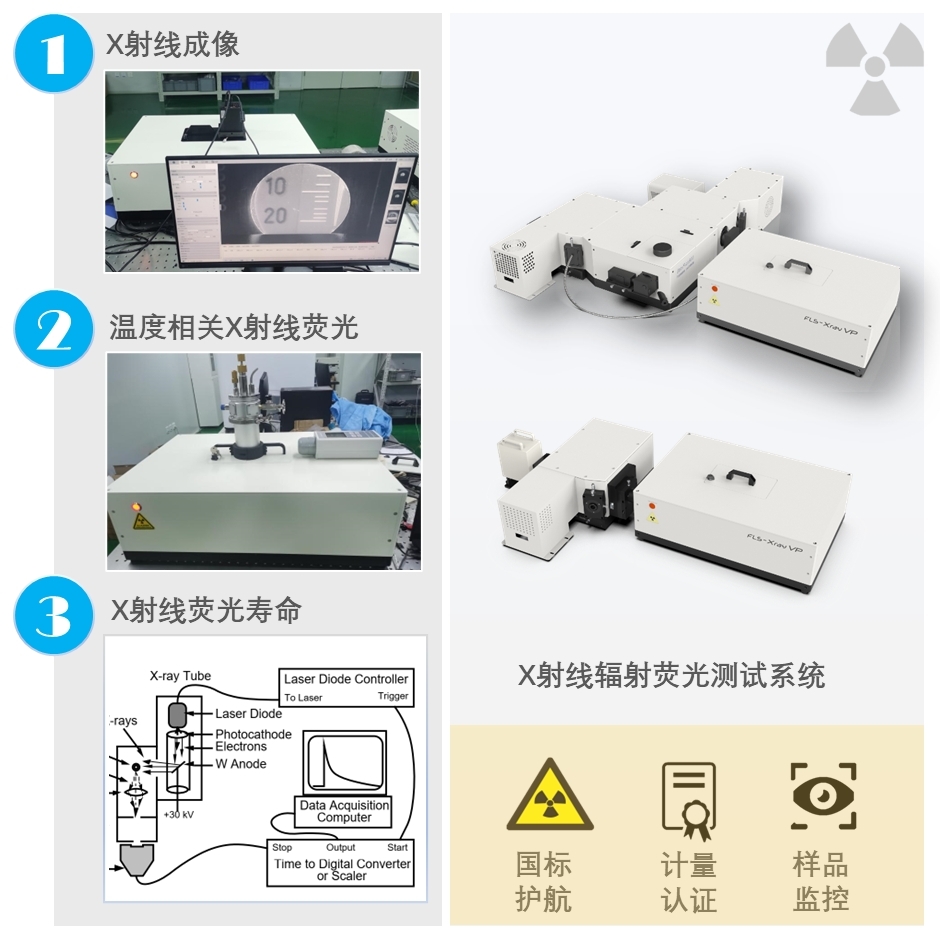 北京卓立漢光儀器有限公司擁有中國人民共和國環(huán)境部核準(zhǔn)的輻射安全許可證(證書編號:Q0121),可為用戶提供一系列安全可靠的X射線輻射發(fā)光多維測試解決方案。方案集成防護(hù)鉛箱為測試人員提供安全保障,輻射防護(hù)滿足國標(biāo)《X射線衍射儀和熒光分析儀衛(wèi)視防護(hù)標(biāo)準(zhǔn)》(GBZ115-2023)要求。系統(tǒng)可進(jìn)行光譜測試功能、成像測試及余輝測試,此外可以加載低溫恒溫器、輻射劑量表等測試附件進(jìn)行更多功能的拓展。