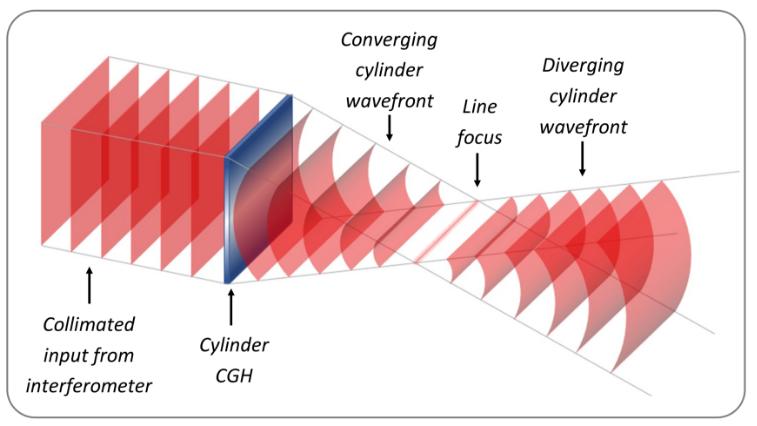 圓柱形 CGH 是一種衍射光學元件,可以將準直干涉儀波前轉(zhuǎn)換為會聚圓柱形波前。凹凸圓柱形光學元件可以用相同的 CGH 在共焦零點測試中進行測量。凸面圓柱形光學元件位于會聚波前,凹面圓柱形光學元件則位于發(fā)散波前。