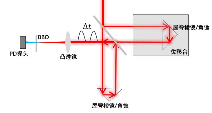 在超快科學(xué)領(lǐng)域,延遲線常用于自相關(guān)測脈寬,以及泵浦探測,時(shí)域光譜等領(lǐng)域。由于飛秒量級的時(shí)間已經(jīng)遠(yuǎn)超出了示波器、PD探頭的響應(yīng)速度極限,因此無法直接通過示波器等儀器直接測出脈寬,一般通過自相關(guān)的方式進(jìn)行測量,自相關(guān)測量的原理是將一個脈沖分成等強(qiáng)度的兩個脈沖,使其中一束光通過延遲線后將兩束光合束并通過倍頻晶體(如BBO),通過PD探頭測量,PD探頭的測量結(jié)果正比于光強(qiáng)