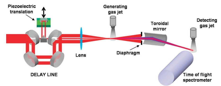 下圖所示為一套基于馬赫-曾德爾干涉設(shè)計(jì)的泵浦探測光路,采用環(huán)形反射鏡分割與合并波前。輸入光束的中心部分被一對安裝在壓電位移臺上的直角反射鏡反射,充當(dāng)延遲線的作用。延遲的步長與精度取決于壓電位移臺的步長與精度。在合束后,光束的外環(huán)形部分被聚焦成氣體射流產(chǎn)生高次諧波。光束的中心部分用于探測,基于這種設(shè)計(jì)的光路,可通過調(diào)節(jié)阿秒脈沖串和紅外基頻激光場之間的相位差觀測到邊帶的調(diào)制,從而重建原始的阿秒脈沖信息。