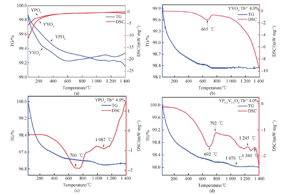 圖1 YVO4 與YPO4 (a)、YVO4∶Tb3+(b)、YPO4∶Tb3+ (c)及YV0.5P0.5O4∶Tb3+(d)的TG-DSC 曲線