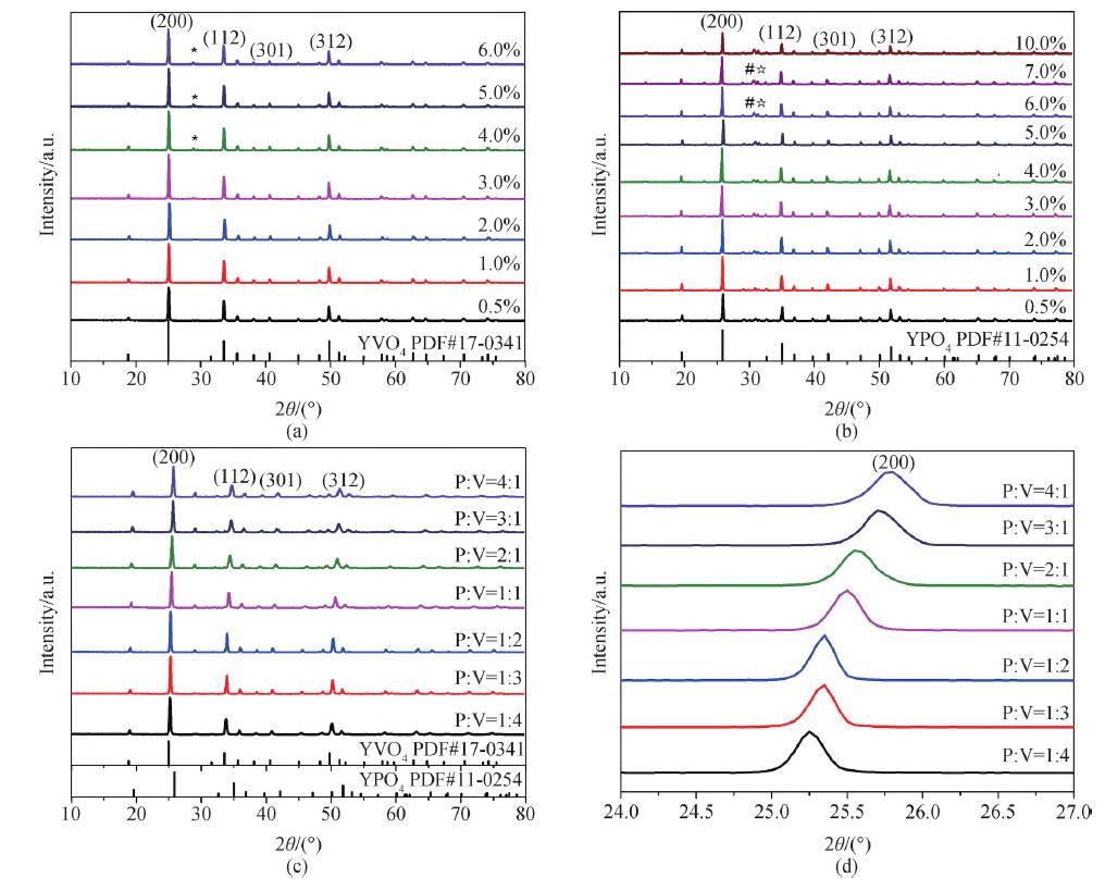 圖2 樣品的XRD 圖譜。(a) YVO4∶Tb3+ ;(b) YVO4∶Tb3+;(c)YV1-xPxO4∶Tb3+;(d) YV1-xPxO4∶Tb3+ (200)晶面衍射峰