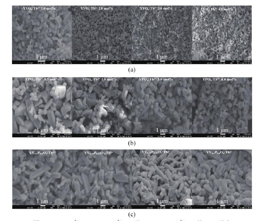 圖3 YVO4∶Tb3+ (a)、YPO4∶Tb3+ (b)及YV1-xPxO4∶Tb3+ (c)的SEM 照片