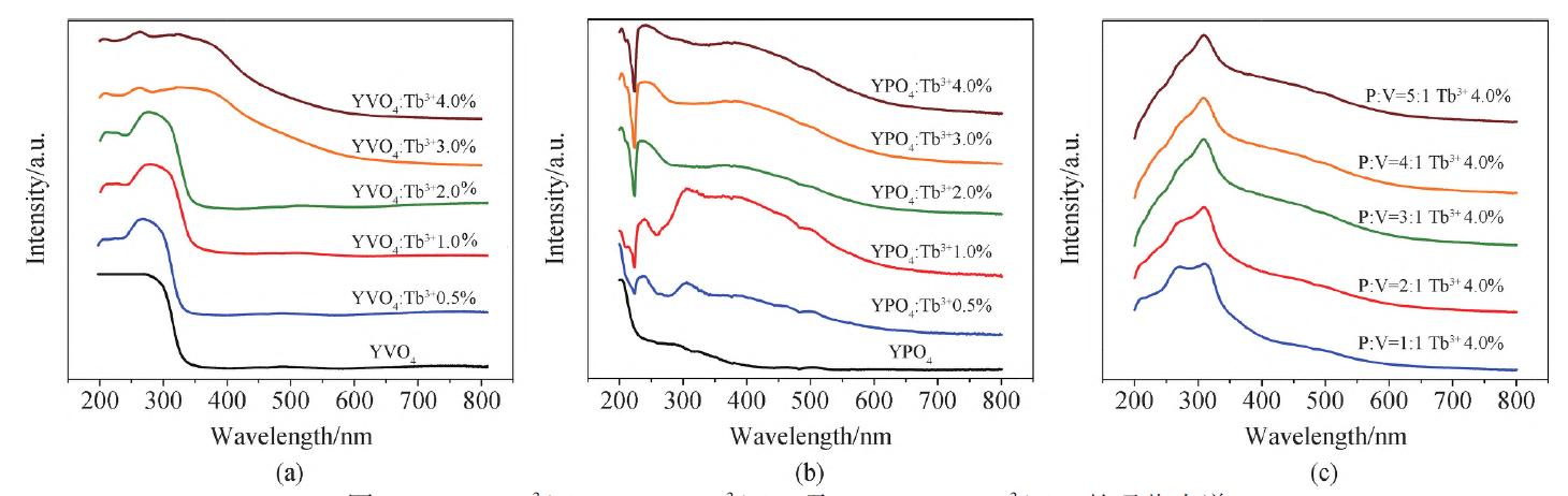 圖7 YVO4:Tb3+, YV1-xPxO4:Tb3+和YPO4:Tb3+的激發(fā)、發(fā)射光譜