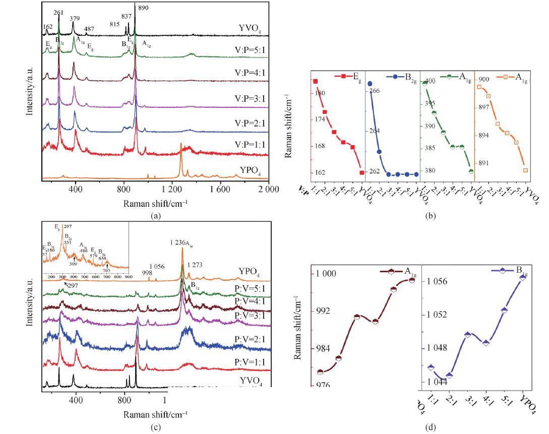 為分析樣品聲子能量分布,采用北京卓立漢光儀器有限公司生產(chǎn)的 Finder 930全自動激光顯微共聚焦拉曼光譜儀測試了熒光粉樣品的拉曼光譜(圖6), YVO4、YPO4的原胞均在布里淵區(qū)中心產(chǎn)生12個拉曼活性聲子分支,具有相同振動模式, YV1-xPxO4中振動頻率在998 cm-1 的散射峰對應YPO4 的A1g (2)特征峰,其余可辨散射峰均為YVO4的特征峰。YVO4的Eg (2)、B2g、A1g(1)和A1g(2)四個內(nèi)模散射峰位隨V:P比例增加向低波數(shù)方向移動,如圖6(b)所示,表明VO4四面體中V—O平均鍵長隨V含量增加而變長,V—O鍵振動頻率降低,特征峰形向高波數(shù)呈現(xiàn)非對稱性展寬源于聲子限制效應, YV1-xPxO4晶格完整性及平移對稱性較YVO4 有所降低,參與拉曼散射聲子數(shù)量增加,譜峰出現(xiàn)拖尾展寬現(xiàn)象。YPO4及不同P:V =比例YV1-xPxO4的拉曼散射如圖6(c)所示,左上插圖為YPO4在120 ~900cm-1 拉曼散射放大圖。圖中除B1g(2)外,YPO4其余11個征散射峰全部觀測到。YPO4中399 和705cm-1 處非特征的拉曼散射峰,可能是因為局域晶格畸變產(chǎn)生了非本征YPO4的拉曼散射。YPO4中大于1200cm-1高能聲子可能涉及到更高一級的拉曼散射效應。YV1-xPxO4中VO4四面體內(nèi)模振動顯著,P:V為5:1時,VO4四面體內(nèi)模振動影響依然存在,頻率低于900 cm-1,依然難以分辨YPO4內(nèi)模振動。YPO4高頻內(nèi)模振動A1g(2)、B1g(4)隨P:V變化如圖6(d)所示,表明PO4四面體中P—O平均鍵長隨P含量增加而變短,P—O鍵振動頻率增加。綜上,YVO4 的拉曼頻譜分布不均勻,*大聲子能量集中在815~890cm-1、500~800cm-1。YPO4一階拉曼頻譜分布較為均勻,內(nèi)模振動聲子能量接近。調(diào)整V:P比例,一定范圍內(nèi)可有效調(diào)控YV1-xPxO4聲子能量分布,從而調(diào)整材料的無輻射弛豫速率。