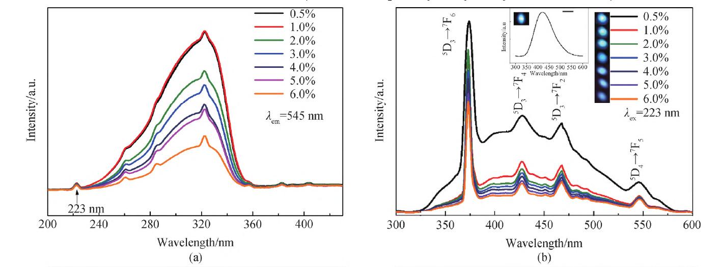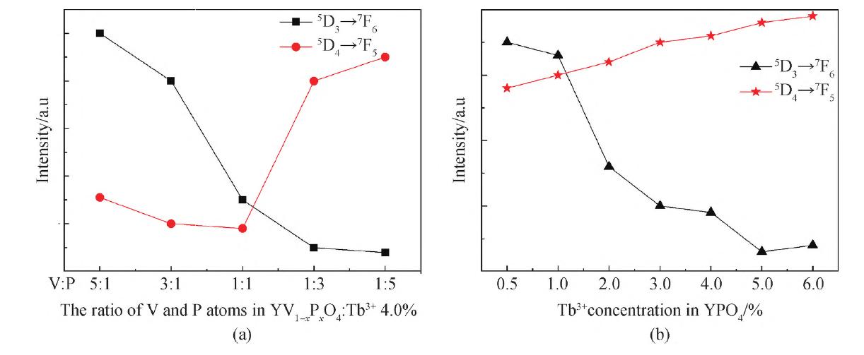 圖8 5D3→7F6和的5D4→7F5發(fā)光相對強度隨基質(zhì)組分(a)、摻雜濃度變化(b)