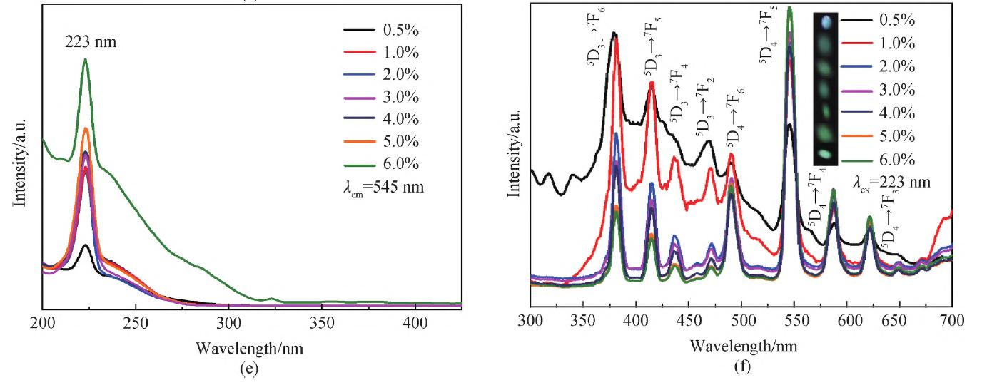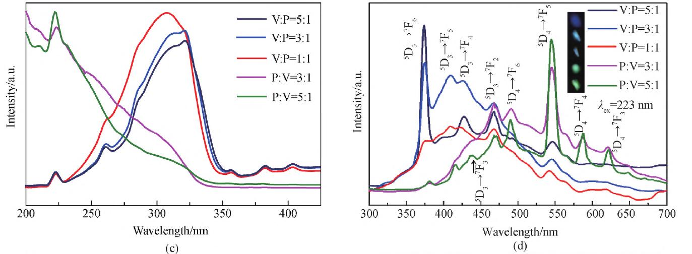 圖7(b)表明YVO4本征發(fā)光為藍光,發(fā)光中心位于433 nm 處,對應于VO43- 激發(fā)態(tài)3T2→1A1和3T1→1A1躍遷。YVO4:Tb3+射光譜包含VO43-本征發(fā)光帶和Tb3+的5D3→7F6(373 nm)、5D3→7F4 (428 nm)、5D3→7F2 (468 nm)及5D43→7F5 (545 nm)躍遷發(fā)光, Tb3+發(fā)光以5D3發(fā)光為主。圖7c表明P元素比例增加,VO43- 的電荷遷移躍遷吸收帶消失, Tb3+的基態(tài)7F到激發(fā)態(tài)7D的f-d 躍遷占據(jù)主導。圖5d表明隨P元素增加,發(fā)射光譜呈現(xiàn)由藍到綠轉變,表明基質(zhì)組分對Tb3+發(fā)光具有一定調(diào)控作用。圖7(f)插圖展現(xiàn)了摻雜濃度對發(fā)光的調(diào)節(jié)作用,隨Tb3+摻雜濃度增加,發(fā)光由青光變?yōu)榫G光。