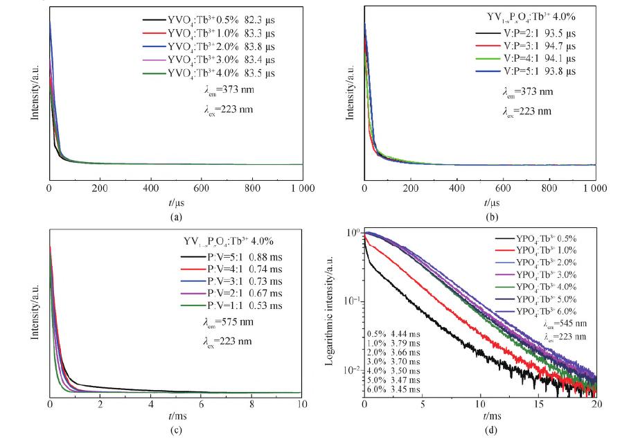 圖9 YVO4:Tb3+ (a)和YV1-xPxO4:Tb3+ (b)在373nm發(fā)射波長監(jiān)測下熒光衰減曲線, YV1-xPxO4:Tb3+ (c)和YV1-xPxO4:Tb3+ (d)在545 nm 發(fā)射波長監(jiān)測下熒光衰減曲線