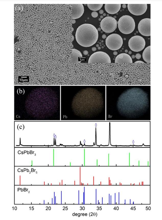 樣品的SEM圖像如圖1a所示。微球均勻地分布在硅襯底上, PbBr2將CsPbBr3全部轉(zhuǎn)換為CsPb2Br5