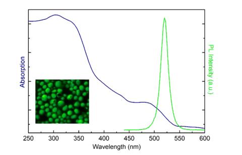 圖2 室溫下吸收光譜(藍(lán)色)和PL光譜(綠色)