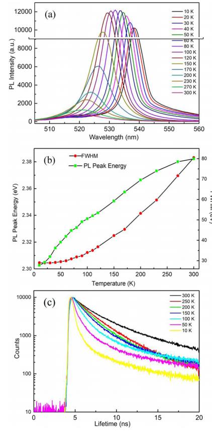 圖3 (a) PL光譜的溫度演化,(b)峰中心和峰寬,(c)光譜峰位在10 ~ 300 K范圍內(nèi)的PL衰減曲線。
