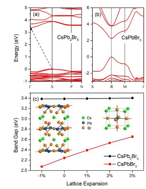 圖4 晶格能帶圖,(a)CsPb2Br5,(b)CsPbBr3,(c)帶隙隨晶格改變情況