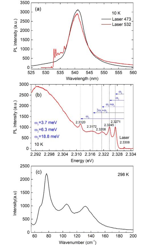 圖5 CsPb2Br5微球的拉曼光譜。 (a) 473和532 nm激光在10 K激發(fā)下的PL光譜 (b) 532 nm激發(fā)的共振拉曼信號(hào);(c)室溫下632.8 nm激發(fā)下的拉曼光譜信號(hào)