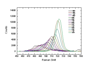 使用532激發(fā)單晶硅在不同溫度下的拉曼峰的測(cè)試結(jié)果如下