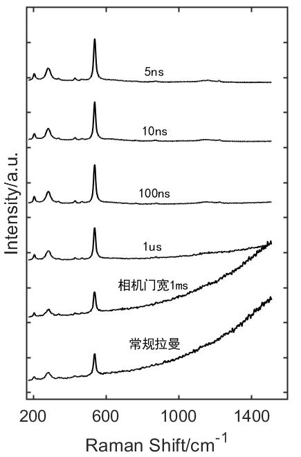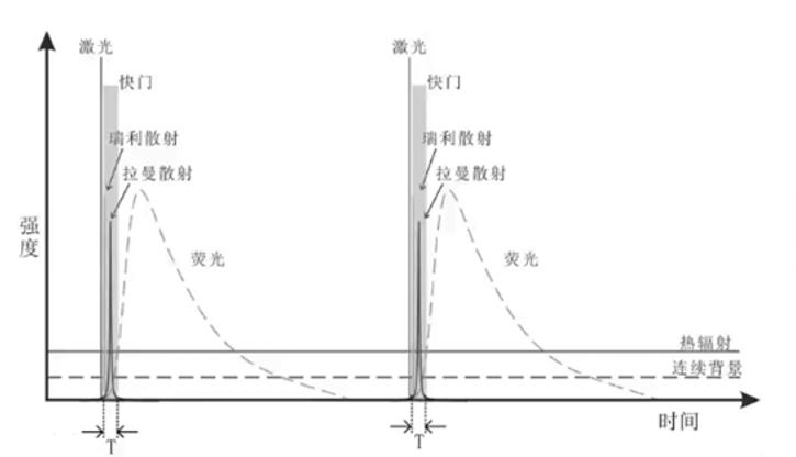 脈沖激光時(shí)間分辨拉曼光譜技術(shù)是從時(shí)間域上將拉曼散射信號(hào)與絕大部分背景熱輻射分離開(kāi),用脈沖激光替代連續(xù)激光,因?yàn)槔盘?hào)是在激光打過(guò)去fs量級(jí)的時(shí)間之后就會(huì)產(chǎn)生,幾乎與激光同步,但是熱輻射背景和熒光信號(hào)較弱;如下圖所示,我們可以選擇在激光與熒光之間的一個(gè)非常短的時(shí)間去采集拉曼信號(hào),此時(shí)可以獲取較高的信噪比;