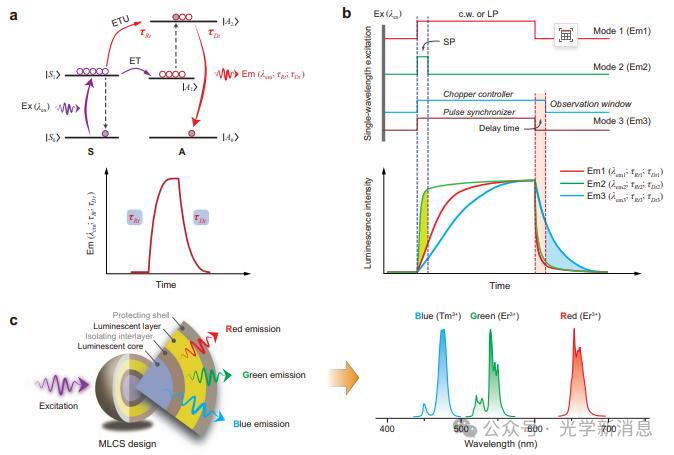 為了在單個納米顆粒中實現(xiàn)單波長響應(yīng)的全彩輸出,研究人員構(gòu)建了一種多層核殼(MLCS)納米結(jié)構(gòu)。將Yb/Tm對共摻雜到核心,Er/Tm/Yb共摻雜到外層發(fā)光殼層,中間生長一層光學(xué)惰性的NaYF?外延層,以避免兩層之間的光譜串?dāng)_,*外層再包覆一層NaYF?殼層,防止表面猝滅效應(yīng)。在該設(shè)計中,發(fā)現(xiàn)980nm連續(xù)波激發(fā)時,核心的藍(lán)色發(fā)射會與外殼層的紅色發(fā)射同時被激活。為解決這一問題,通過在發(fā)光殼層中增加Yb³?含量,部分Yb³?作為能量收集器,捕獲入射的980nm激發(fā)光子,減少到達(dá)核心激活Tm³?的激發(fā)能量,從而在連續(xù)波980nm激發(fā)下實現(xiàn)紅色輸出。在短脈沖980nm激發(fā)時,由于綠色發(fā)射上升時間快,能夠產(chǎn)生綠色發(fā)射。利用時間選通技術(shù),由于Tm³?發(fā)射壽命比Er³?長得多,可濾除短衰減的紅色和綠色發(fā)射,實現(xiàn)藍(lán)色發(fā)射輸出。*終,在合適的激發(fā)模式下,實現(xiàn)了RGB顏色可調(diào)的發(fā)射,首次在單個MLCS納米顆粒中通過單一980nm激光的激發(fā)模式調(diào)控實現(xiàn)了全彩輸出。